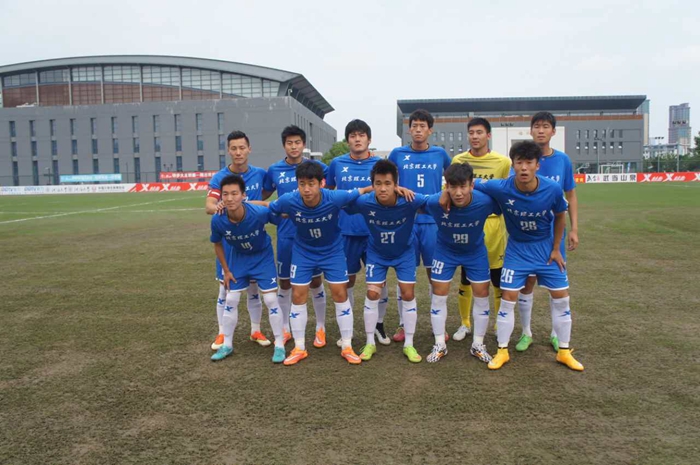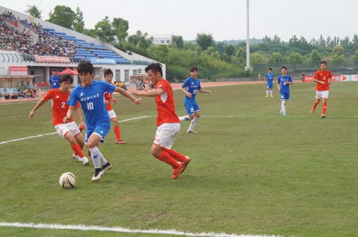 下午15点整,主裁判吹响全场比赛开始的哨音,一场相互“知根知底”的对攻战就此上演。剑指冠军的北理工队率先发难:第4分钟,北理工发出前场界外球交给场上队长7号韩光徽,韩光徽领球转身,顺势推给插上的19号何子超,后者瞄向后点起球传中,被河海大学防守队员奋力破坏。第15分钟,北理工获得罚球区左侧定位球机会,韩光徽罚至前点寻找身高1米92的5号王伟,后者头球后蹭遗憾击中门框。第21分钟,河海大学20号队员接传球后成功突破北理工防线,即将形成破门良机时,北理工中后卫26号静轩拍马杀到将球破坏。第24分钟,河海大学队员在多名理工队员的包夹下灵光一现,抬脚垫射,皮球被北理工门将刘天鑫摘下。随后,比赛变得胶着,河海大学在防守端的表现堪称完美,北理工向河海大学球门发起数次冲击均无功而返。第44分钟,河海大学前场断球,就地打出快速反击并成功杀入北理工罚球区,随后的大力射门经北理工后卫何子超倒地拦挡后减速,北理工门将刘天鑫轻松将球没收。随即上半场比赛结束,双方均无建树。